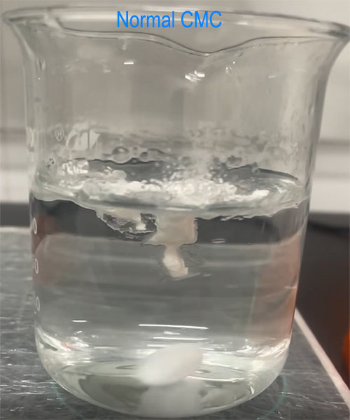 As shown in the figure, MES 60000 instantly forms a homogeneous dispersion upon water addition, followed by a gradual hydration process. In contrast, conventional CMC hydrates immediately upon contact with water and tends to float on the surface.